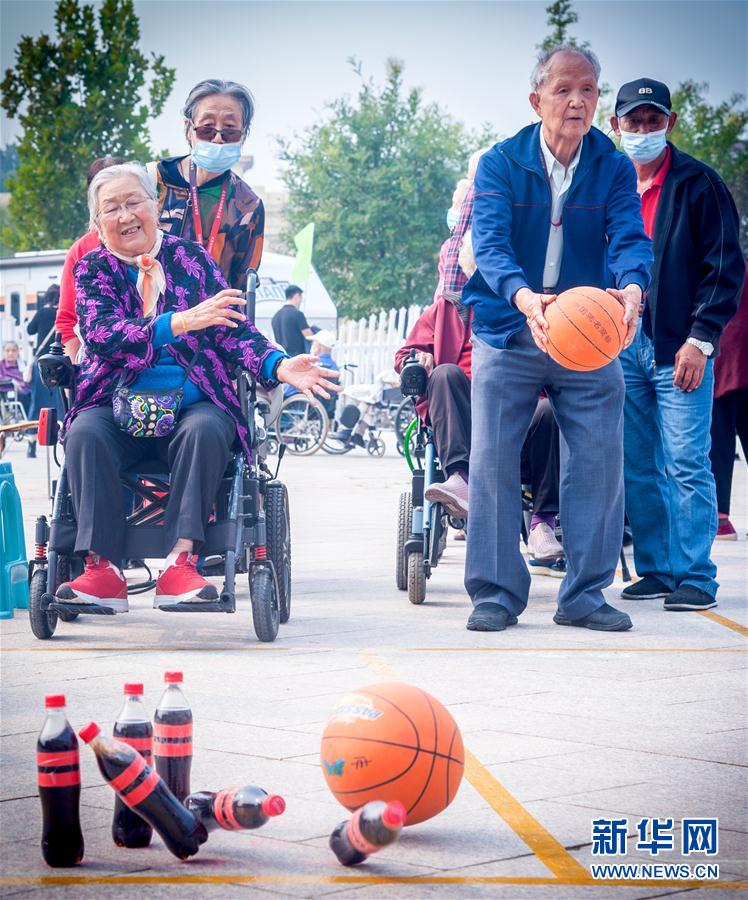 9月28日,85岁的李金英(左)在趣味保龄球比赛中。 国庆、中秋佳节前夕,北京太阳城老年公寓举办了一场趣味运动会,颠球跑、轮椅竞技、投篮球、趣味保龄球和太极剑等项目吸引了众多在住老年人参加。 新华社发(陈晓伟摄)