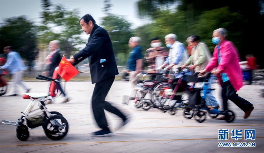 9月28日,80岁的王俊山(前左)在轮椅竞技比赛中。 国庆、中秋佳节前夕,北京太阳城老年公寓举办了一场趣味运动会,颠球跑、轮椅竞技、投篮球、趣味保龄球和太极剑等项目吸引了众多在住老年人参加。 新华社发(陈晓伟摄)