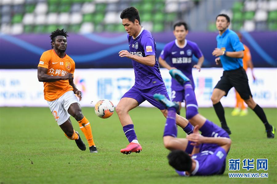 9月28日,天津泰达队球员宋岳(左二)在比赛中带球突破。 当日,在2020赛季中国足球协会超级联赛第一阶段(苏州赛区)第14轮比赛中,天津泰达队以0比0战平武汉卓尔队。 新华社记者 李博 摄