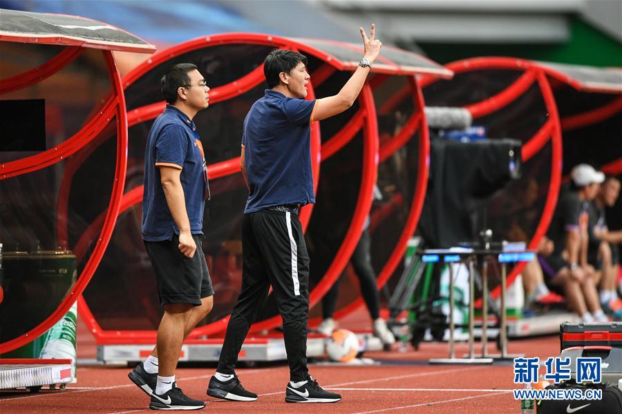 9月28日,武汉卓尔队代理主教练庞利(右一)在场边指挥。 当日,在2020赛季中国足球协会超级联赛第一阶段(苏州赛区)第14轮比赛中,天津泰达队以0比0战平武汉卓尔队。 新华社记者 李博 摄