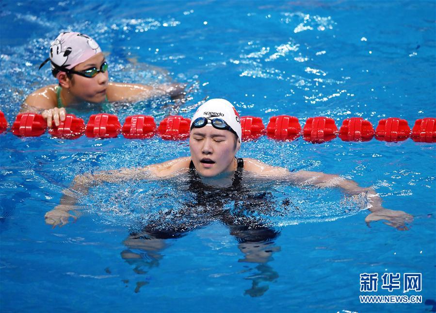 9月28日,叶诗文(前)在比赛后。 当日,在青岛举行的2020全国游泳冠军赛暨东京奥运会达标赛女子400米个人混合泳预赛中,浙江队选手叶诗文以4分43秒93的成绩获得第四名。 新华社记者 李紫恒 摄