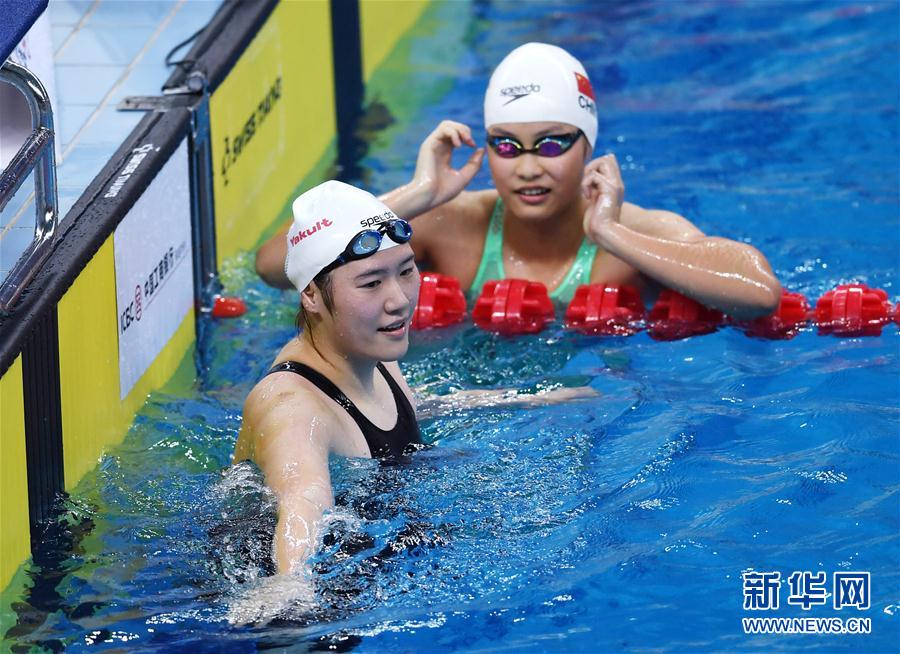 9月28日,叶诗文(左)与余依婷在比赛后交流。 当日,在青岛举行的2020全国游泳冠军赛暨东京奥运会达标赛女子400米个人混合泳预赛中,浙江队选手叶诗文以4分43秒93的成绩获得第四名。 新华社记者 李紫恒 摄