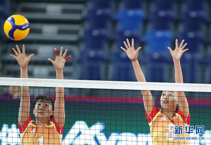 9月28日,北京汽车队球员任凯懿(左)和薛翼枝在比赛中拦网。 当日,在广东江门举行的2020年全国女排锦标赛第一阶段A组第六轮比赛中,江苏中天钢铁队以3比0战胜北京汽车队。 新华社记者秦朗摄
