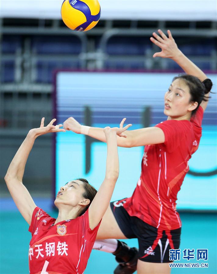 9月28日,江苏中天钢铁队球员刁琳宇(左)在比赛中传球。 当日,在广东江门举行的2020年全国女排锦标赛第一阶段A组第六轮比赛中,江苏中天钢铁队以3比0战胜北京汽车队。 新华社记者秦朗摄