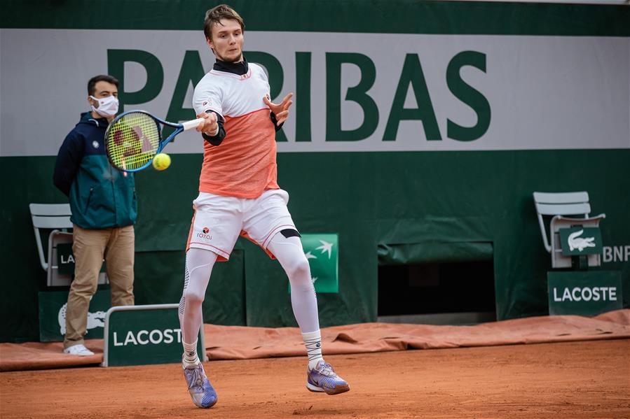 9月28日,布勃利克在比赛中回球。 当日,在法国巴黎进行的2020年法国网球公开赛男单首轮比赛中,哈萨克斯坦选手布勃利克以3比1战胜法国选手孟菲斯,晋级第二轮。 新华社发(奥雷利安·莫里萨尔摄)