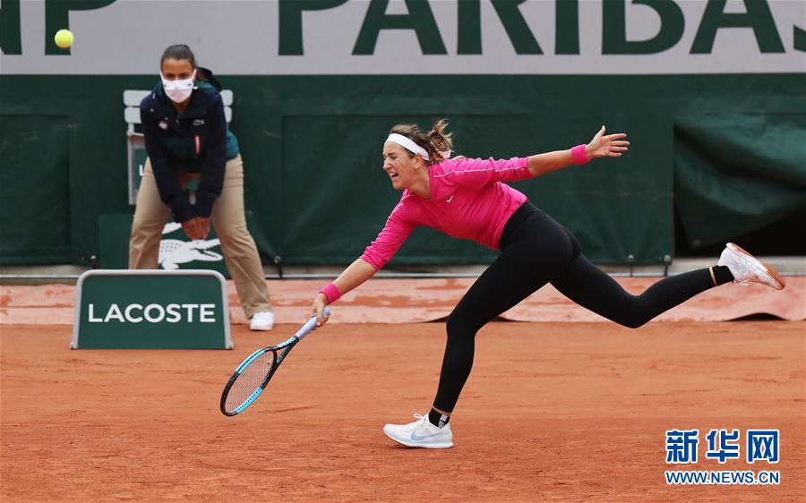 9月30日,阿扎伦卡在比赛中回球。 当日,在法国巴黎进行的2020年法国网球公开赛女单第二轮比赛中,白俄罗斯选手阿扎伦卡以0比2不敌斯洛伐克选手施米德洛娃,止步第二轮。 新华社记者 高静 摄