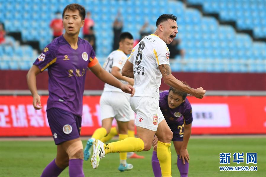 9月30日,长春亚泰队球员卢卡斯·索萨(中)在比赛中庆祝进球。 当日,在2020中国足球协会甲级联赛第一阶段(常州赛区)第6轮比赛中,黑龙江FC队以1比1战平长春亚泰队。 新华社发(史康 摄)