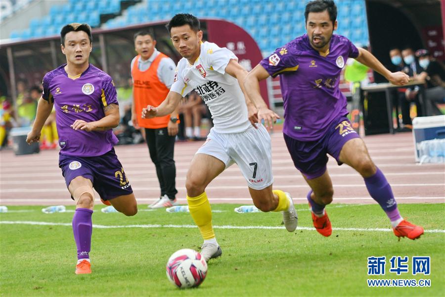 9月30日,长春亚泰队球员周大地(中)在比赛中带球突破。 当日,在2020中国足球协会甲级联赛第一阶段(常州赛区)第6轮比赛中,黑龙江FC队以1比1战平长春亚泰队。 新华社发(史康 摄)