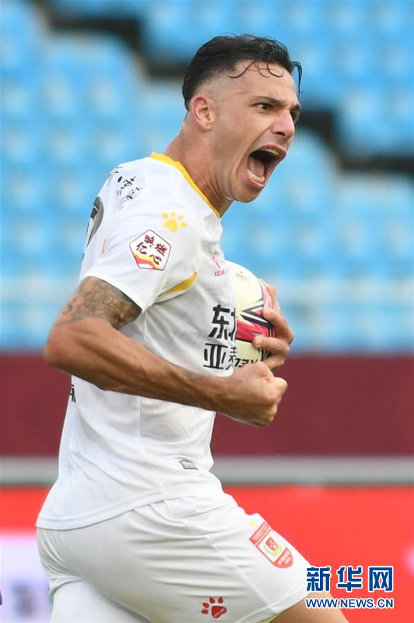 9月30日,长春亚泰队球员卢卡斯·索萨在比赛中庆祝进球。 当日,在2020中国足球协会甲级联赛第一阶段(常州赛区)第6轮比赛中,黑龙江FC队以1比1战平长春亚泰队。 新华社发(史康 摄)