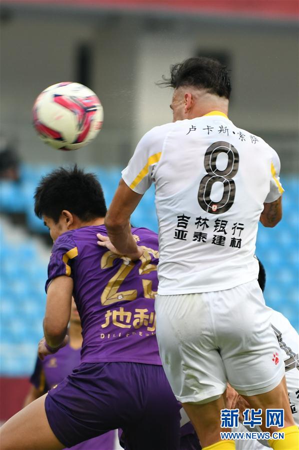 9月30日,长春亚泰队球员卢卡斯·索萨(右)在比赛中头球得分。 当日,在2020中国足球协会甲级联赛第一阶段(常州赛区)第6轮比赛中,黑龙江FC队以1比1战平长春亚泰队。 新华社发(史康 摄)