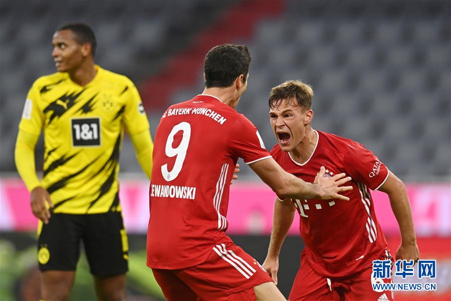 9月30日,拜仁慕尼黑队球员基米希(右)在比赛中庆祝进球。 当日,在2019-2020赛季德国超级杯比赛中,拜仁慕尼黑队以3比2战胜多特蒙德队,夺得冠军。 新华社/路透