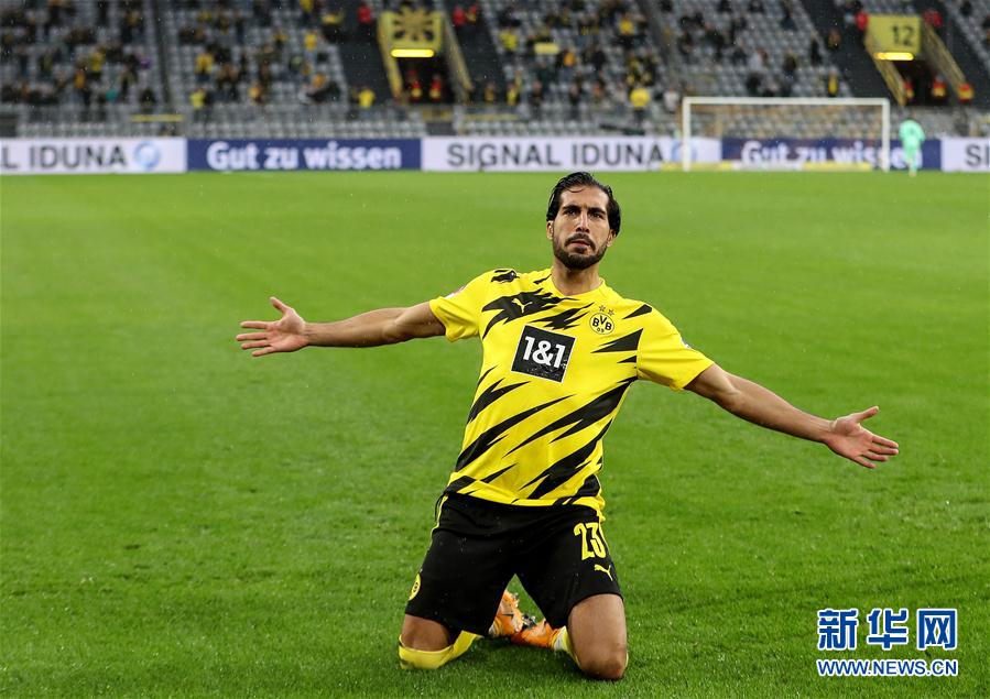 10月3日,多特蒙德队球员埃姆雷·詹在比赛中庆祝进球。 当日,在2020-2021赛季德国足球甲级联赛第三轮比赛中,多特蒙德队主场以4比0战胜弗赖堡队。 新华社发(约阿希姆·毕瓦勒兹 摄)