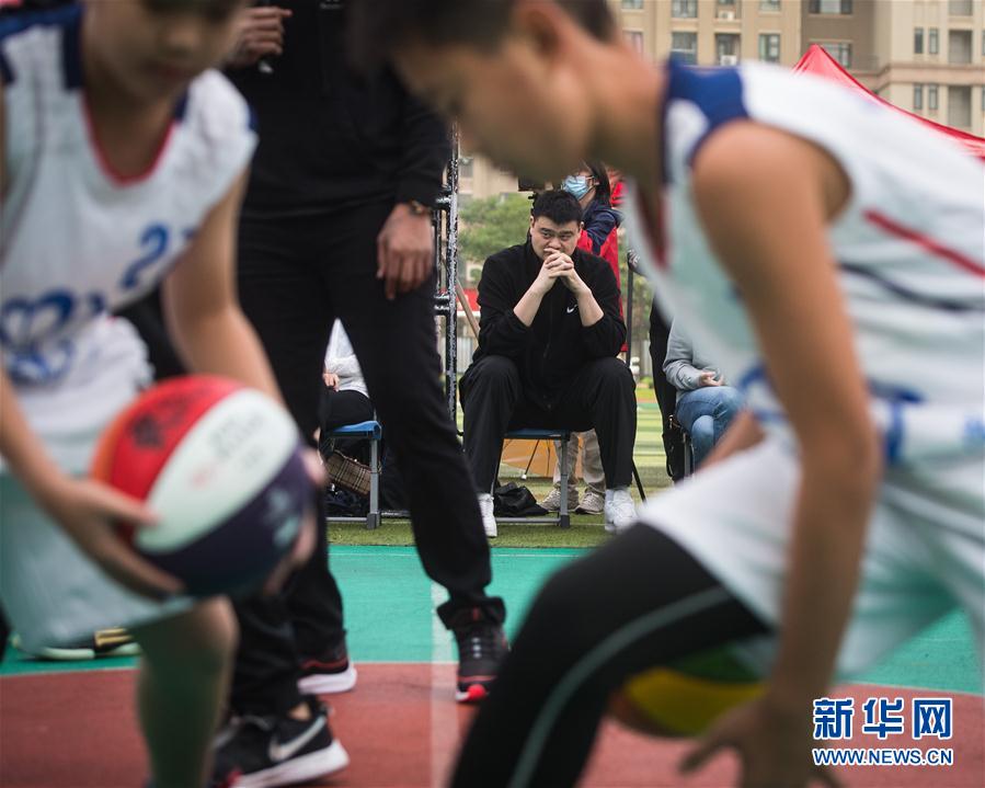 10月4日,姚基金创始人姚明(中)在场边观看小球员训练。 当日,姚基金创始人姚明与姚基金慈善赛成员来到武汉奥林小学,现场教授小学生篮球训练要领,享受篮球带来的快乐。 新华社记者肖艺九摄