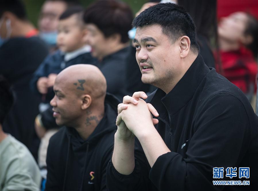 10月4日,姚基金创始人姚明在场边观看小球员训练。 当日,姚基金创始人姚明与姚基金慈善赛成员来到武汉奥林小学,现场教授小学生篮球训练要领,享受篮球带来的快乐。 新华社记者肖艺九摄