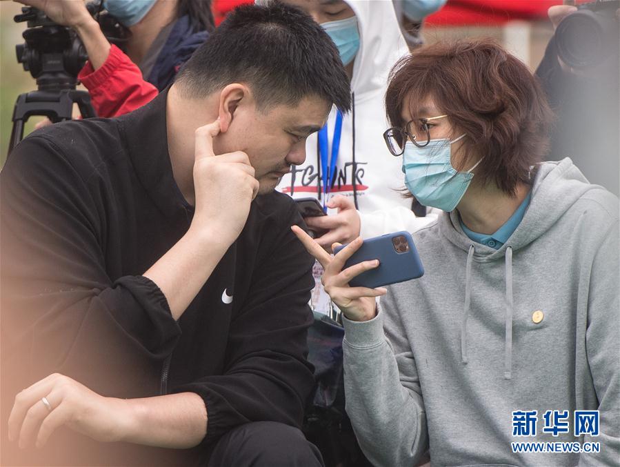 10月4日,姚基金创始人姚明(左)与姚基金理事长叶莉在场边交流。 当日,姚基金创始人姚明与姚基金慈善赛成员来到武汉奥林小学,现场教授小学生篮球训练要领,享受篮球带来的快乐。 新华社记者肖艺九摄