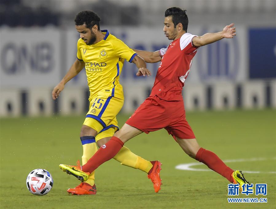 10月3日,伊朗波斯波利斯队球员伊赫桑与沙特艾纳斯队球员阿西里(左)在比赛中拼抢。 当日,在卡塔尔首都多哈进行的亚洲足球冠军联赛半决赛中,伊朗波斯波利斯队和沙特艾纳斯队在120分钟内战成1比1平,最终伊朗波斯波利斯队在点球大战中以5比3胜出,晋级决赛。 新华社发(尼库摄)