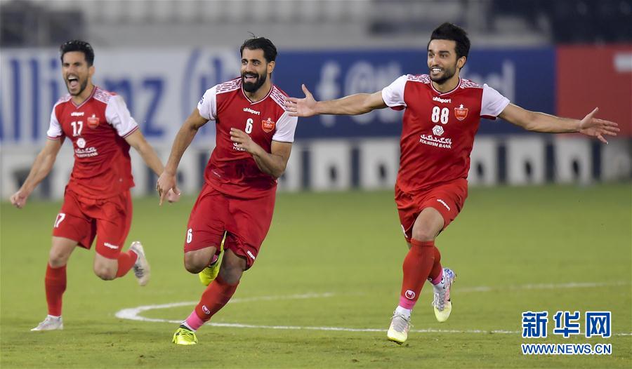 10月3日,伊朗波斯波利斯队球员庆祝获胜。 当日,在卡塔尔首都多哈进行的亚洲足球冠军联赛半决赛中,伊朗波斯波利斯队和沙特艾纳斯队在120分钟内战成1比1平,最终伊朗波斯波利斯队在点球大战中以5比3胜出,晋级决赛。 新华社发(尼库摄)