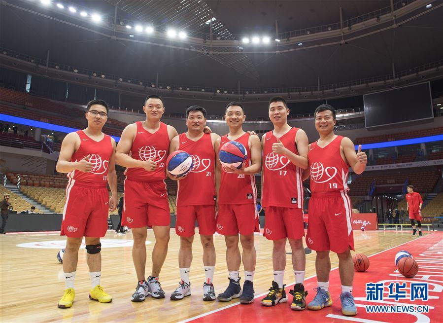 10月4日,参赛的抗疫医护人员邓宇、吕正涛、袁玉峰、祝文涛、张东东、何雅兴(从左至右)身着“男丁格尔明星队”球服在赛前合影。 当日,2020姚基金慈善赛在武汉体育中心举行。对阵双方为国家队主教练杜锋率领的“中国篮球明星队”和北京控股队主教练马布里挂帅的“男丁格尔明星队”。“男丁格尔明星队”由抗疫医护人员和国际球员、文艺明星组成。 新华社记者肖艺九摄