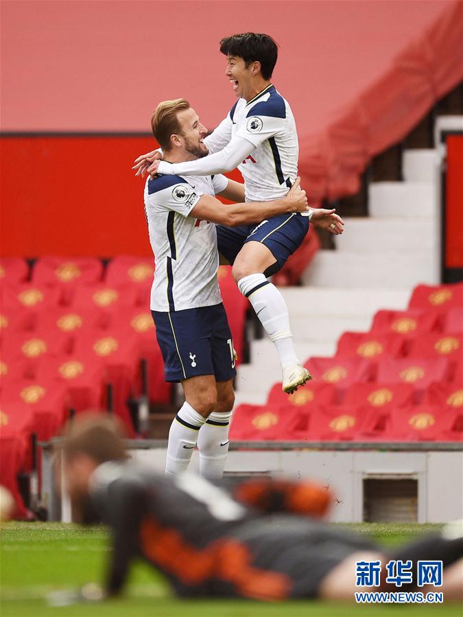 10月4日,热刺队球员孙兴民(右)打入球队第二粒进球后与队友凯恩庆祝。 当日,在2020-2021赛季英格兰足球超级联赛第四轮比赛中,曼彻斯特联队主场以1比6不敌托特纳姆热刺队。 新华社/路透
