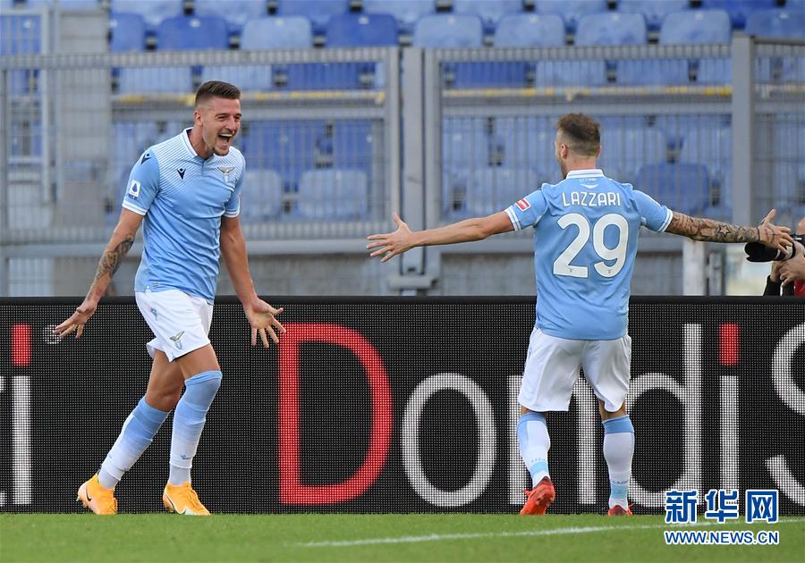 10月4日,拉齐奥队球员米林科维奇-萨维奇(左)在进球后与队友庆祝。 当日,在2020-2021赛季意大利足球甲级联赛第三轮比赛中,拉齐奥队主场以1比1战平国际米兰队。 新华社发(奥古斯托·卡萨索利摄)