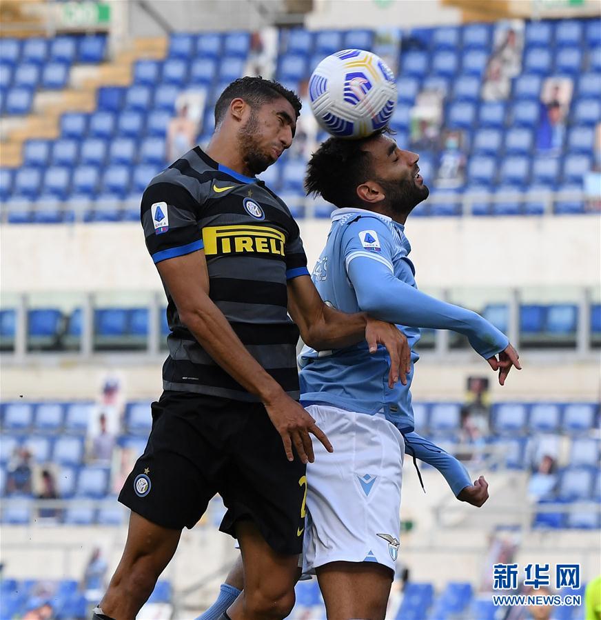 10月4日,拉齐奥队球员法里斯(右)与国际米兰队球员阿什拉夫在比赛中争顶。 当日,在2020-2021赛季意大利足球甲级联赛第三轮比赛中,拉齐奥队主场以1比1战平国际米兰队。 新华社发(奥古斯托·卡萨索利摄)