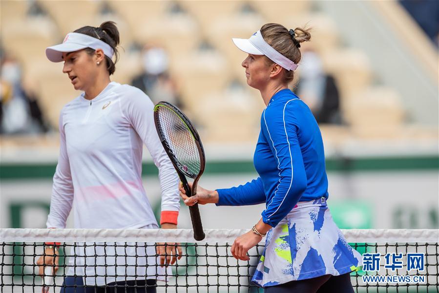 10月4日,斯维托丽娜(右)与加西亚在比赛后。 当日,在法国巴黎进行的2020年法国网球公开赛女单八分之一决赛中,乌克兰选手斯维托丽娜以2比0战胜法国选手加西亚,晋级八强。 新华社发(奥雷利安·莫里萨尔摄)