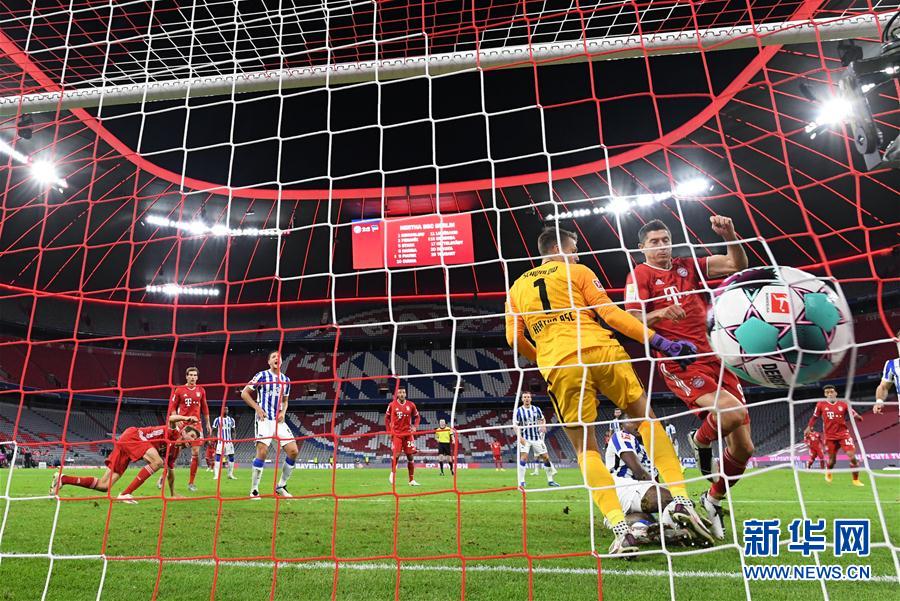 10月4日,拜仁慕尼黑队球员莱万多夫斯基(前右)在比赛中攻入球队第三粒进球。 当日,在2020-2021赛季德国足球甲级联赛第三轮比赛中,拜仁慕尼黑队主场以4比3战胜柏林赫塔队。 新华社/路透
