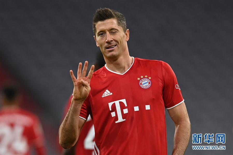 10月4日,拜仁慕尼黑队球员莱万多夫斯基在攻入球队第四粒进球后庆祝。 当日,在2020-2021赛季德国足球甲级联赛第三轮比赛中,拜仁慕尼黑队主场以4比3战胜柏林赫塔队。 新华社/法新