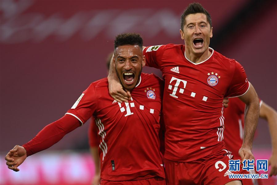 10月4日,拜仁慕尼黑队球员莱万多夫斯基(右)在攻入球队第四粒进球后和队友托利索庆祝。 当日,在2020-2021赛季德国足球甲级联赛第三轮比赛中,拜仁慕尼黑队主场以4比3战胜柏林赫塔队。 新华社/法新