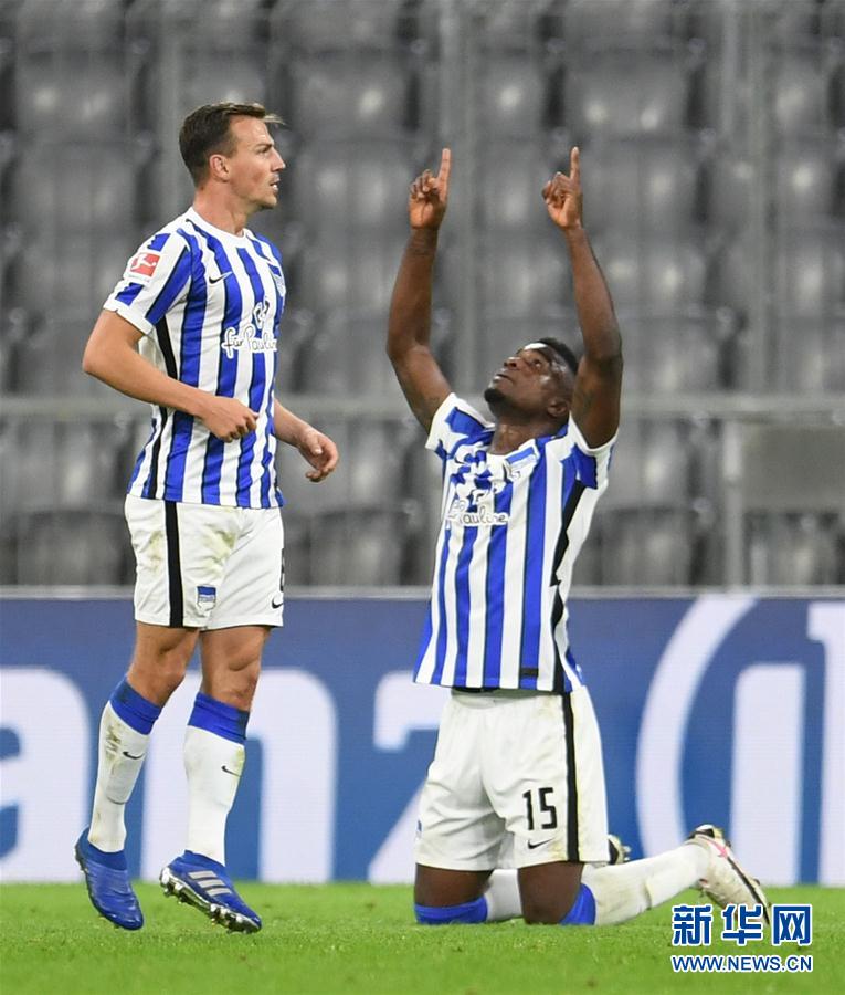 10月4日,柏林赫塔队球员科尔多瓦(右)在进球后庆祝。 当日,在2020-2021赛季德国足球甲级联赛第三轮比赛中,拜仁慕尼黑队主场以4比3战胜柏林赫塔队。 新华社/路透