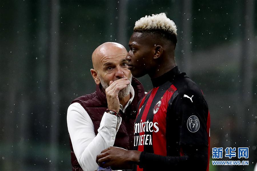 10月4日,AC米兰队主教练皮奥利(左)在比赛中和球员莱奥交流。 当日,在2020-2021赛季意大利足球甲级联赛第三轮比赛中,AC米兰队主场以3比0战胜斯佩齐亚队。 新华社/美联
