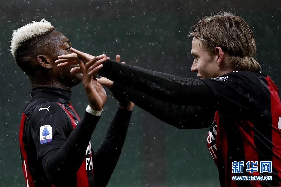 10月4日,AC米兰队球员莱奥在进球后和队友海于格庆祝。 当日,在2020-2021赛季意大利足球甲级联赛第三轮比赛中,AC米兰队主场以3比0战胜斯佩齐亚队。 新华社/美联