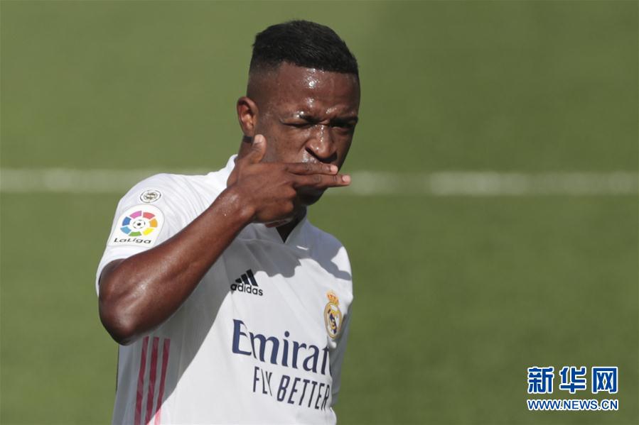 10月4日,皇家马德里队球员维尼修斯进球后庆祝。 当日,在2020-2021赛季西班牙足球甲级联赛第五轮比赛中,皇家马德里队客场以2比0战胜莱万特队。 新华社/美联