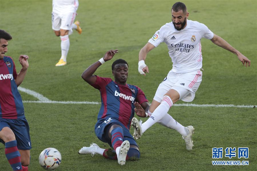 10月4日,皇家马德里队球员本泽马(右一)与莱万特队球员马尔萨(右二)在比赛中拼抢。 当日,在2020-2021赛季西班牙足球甲级联赛第五轮比赛中,皇家马德里队客场以2比0战胜莱万特队。 新华社/美联