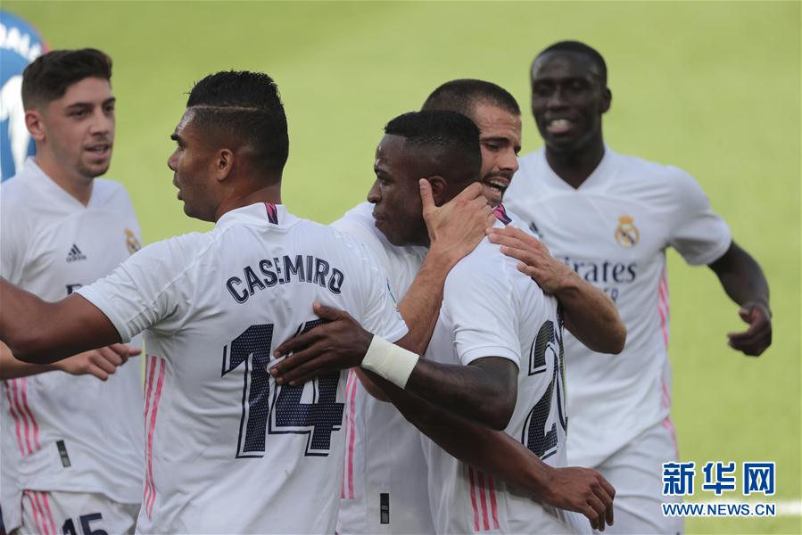 10月4日,皇家马德里队球员维尼修斯(右三)进球后与队友庆祝。 当日,在2020-2021赛季西班牙足球甲级联赛第五轮比赛中,皇家马德里队客场以2比0战胜莱万特队。 新华社/美联