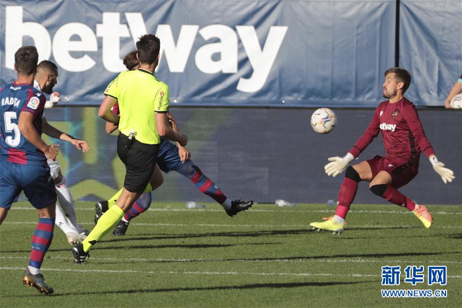 10月4日,皇家马德里队球员本泽马(左二)在比赛中射门得分。 当日,在2020-2021赛季西班牙足球甲级联赛第五轮比赛中,皇家马德里队客场以2比0战胜莱万特队。 新华社/美联