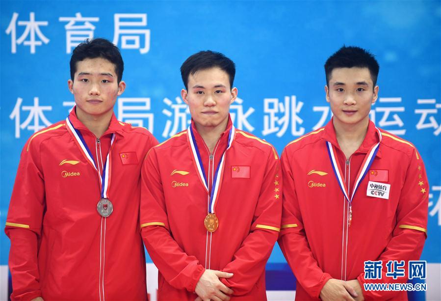 10月4日,冠军广东海印队选手谢思埸(中)、亚军湖北浩沙队选手王宗源(左)和季军北京水立方队选手曹缘在颁奖仪式上。 当日,在河北奥体中心举行的2020年全国跳水冠军赛暨东京奥运会、世界杯预选赛男子三米跳板决赛中,广东海印队选手谢思埸以592.70分夺得冠军,湖北浩沙队选手王宗源和北京水立方队选手曹缘分别以568.75分和550.25分获得亚军和季军。 新华社记者王晓摄