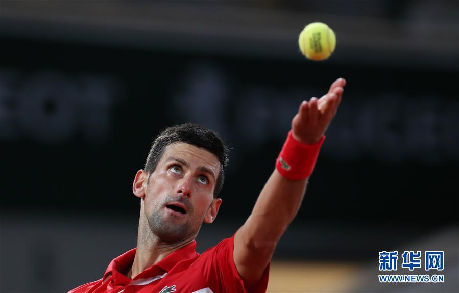 10月5日,焦科维奇在比赛中发球。 当日,在法国巴黎进行的2020年法国网球公开赛男单八分之一决赛中,塞尔维亚选手焦科维奇以3比0战胜俄罗斯选手卡查诺夫,晋级八强。 新华社记者 高静 摄