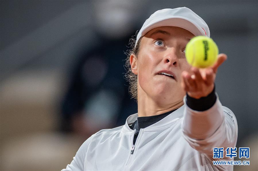 10月6日,斯维亚特克在比赛中发球。 当日,在法国巴黎进行的2020年法国网球公开赛女单四分之一决赛中,波兰选手斯维亚特克以2比0战胜意大利选手特雷维桑,晋级四强。 新华社发(奥雷利安·莫里萨尔摄)