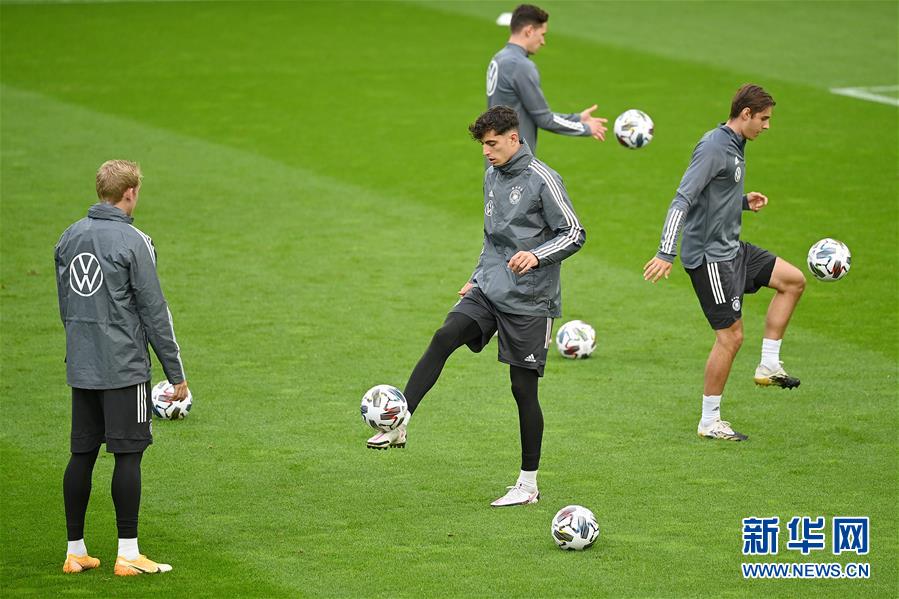 10月6日,德国队球员哈弗茨(中前)和队友在训练中。 当日,德国国家队在德国科隆进行训练,备战10月7日与土耳其队的一场国际足球友谊赛。 新华社发(乌尔里希·胡夫纳格尔摄)
