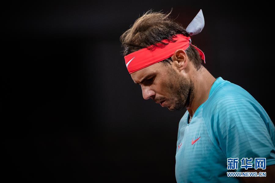 10月6日,纳达尔在比赛中。 当日,在法国巴黎进行的2020年法国网球公开赛男单四分之一决赛中,西班牙选手纳达尔以3比0战胜意大利选手辛纳,晋级四强。 新华社发(奥雷利安·莫里萨尔摄)