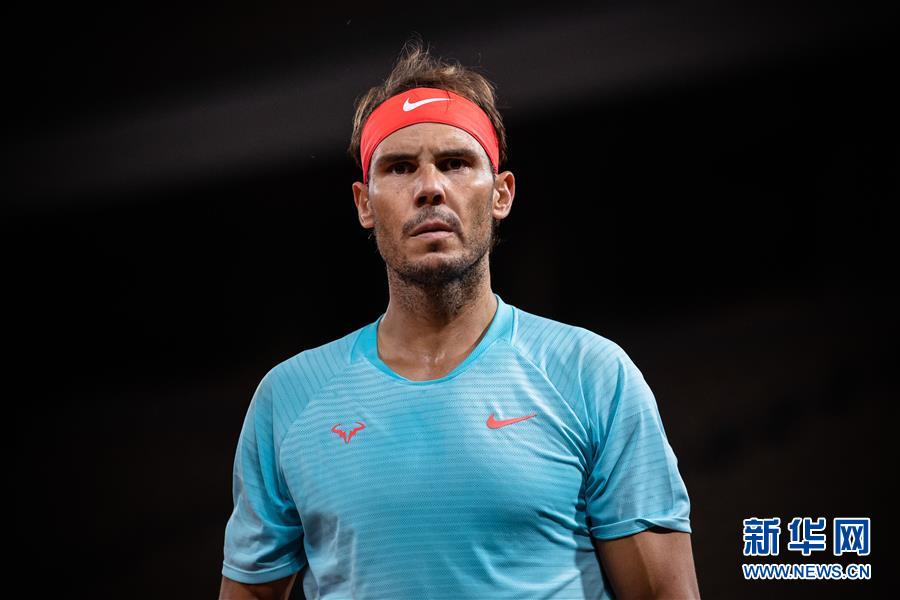 10月6日,纳达尔在比赛中。 当日,在法国巴黎进行的2020年法国网球公开赛男单四分之一决赛中,西班牙选手纳达尔以3比0战胜意大利选手辛纳,晋级四强。 新华社发(奥雷利安·莫里萨尔摄)