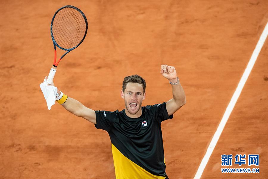 10月6日,施瓦兹曼庆祝胜利。 当日,在法国巴黎进行的2020年法国网球公开赛男单四分之一决赛中,阿根廷选手施瓦兹曼以3比2战胜奥地利选手蒂姆,晋级四强。 新华社发(奥雷利安·莫里萨尔摄)