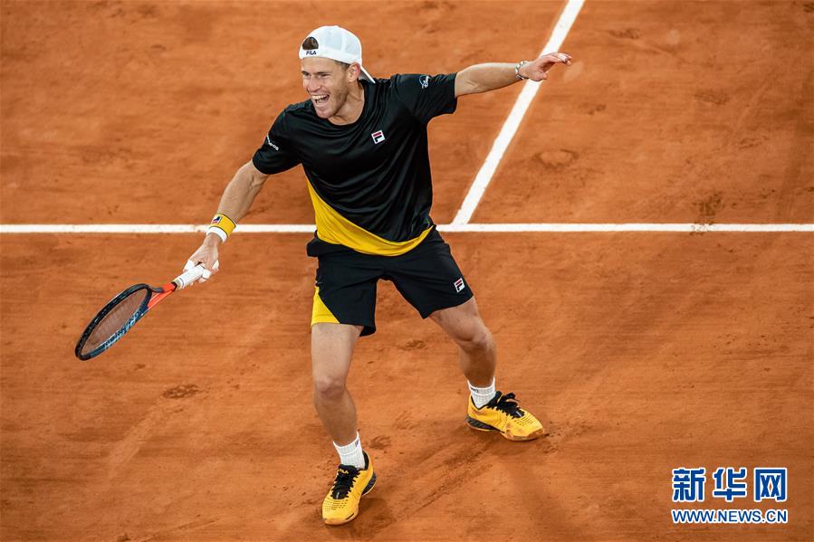 10月6日,施瓦兹曼庆祝胜利。 当日,在法国巴黎进行的2020年法国网球公开赛男单四分之一决赛中,阿根廷选手施瓦兹曼以3比2战胜奥地利选手蒂姆,晋级四强。 新华社发(奥雷利安·莫里萨尔摄)