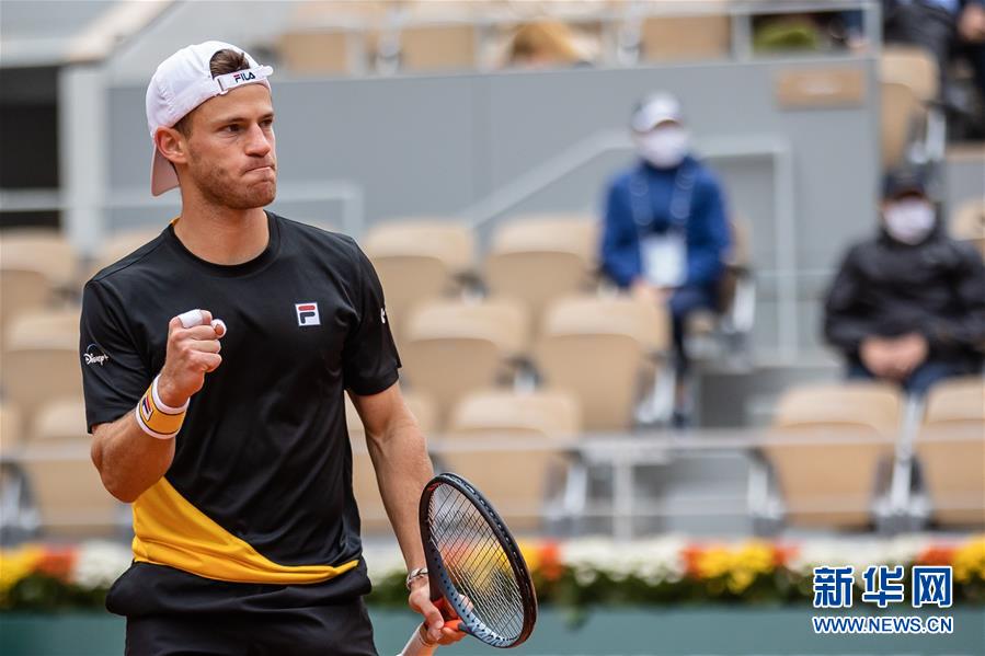 10月6日,施瓦兹曼在比赛中庆祝得分。 当日,在法国巴黎进行的2020年法国网球公开赛男单四分之一决赛中,阿根廷选手施瓦兹曼以3比2战胜奥地利选手蒂姆,晋级四强。 新华社发(奥雷利安·莫里萨尔摄)