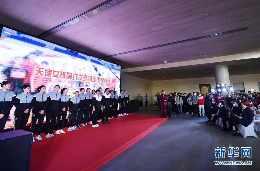 10月7日,不久前夺得2020年全国女排锦标赛冠军的天津渤海银行女排携冠军奖杯来到天津美术馆参加《国家荣誉—中国女排精神展》系列活动——天津女排见面会。《国家荣誉—中国女排精神展》包括祖国至上、团结协作、顽强拼搏、永不言败、海河回响五个部分,通过图像、文字、视频等形式全方位展现中国女排40年来勇夺十次世界冠军的光辉历史和拼搏之路。展览将持续到12月31日。 这是见面会现场(10月7日摄)。 新华社记者李然摄