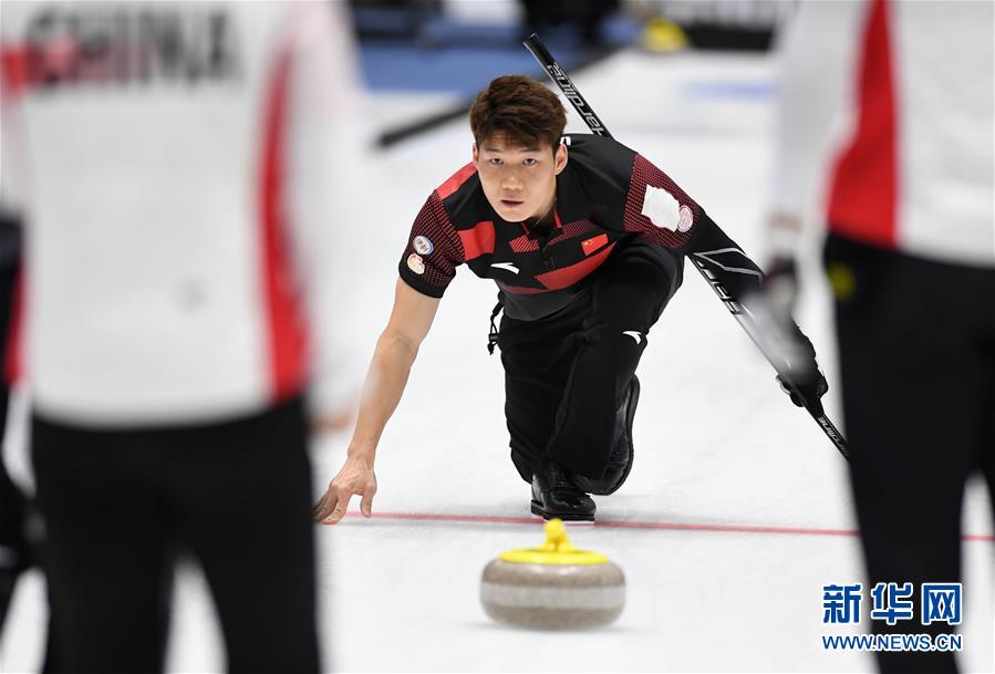 10月7日,一击即中队选手王智宇在混双比赛中。 当日,在北京首钢冰壶馆进行的冰壶国家集训队队内对抗赛第12轮比赛中,扭转乾坤队以27比18战胜一击即中队。 新华社记者 张晨霖 摄