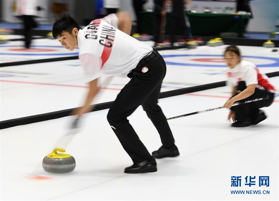 10月7日,扭转乾坤队选手关天琪(左)在混双比赛中擦冰。 当日,在北京首钢冰壶馆进行的冰壶国家集训队队内对抗赛第12轮比赛中,扭转乾坤队以27比18战胜一击即中队。 新华社记者 张晨霖 摄
