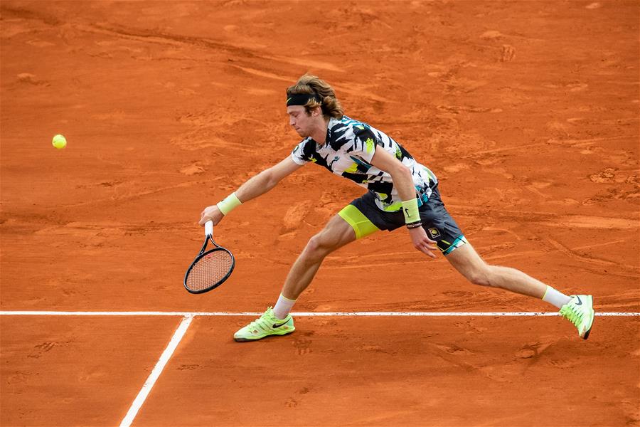 10月7日,鲁布廖夫在比赛中回球。 当日,在法国巴黎进行的2020年法国网球公开赛男单四分之一决赛中,俄罗斯选手鲁布廖夫以0比3不敌希腊选手西西帕斯,无缘四强。 新华社发(奥雷利安·莫里萨尔摄)