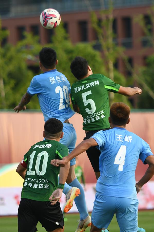 10月7日,四川优必选队球员张佳祺(上左)与新疆雪豹纳欢队队员米尔扎艾克拜·阿力木(上右)争顶。 当日,在2020赛季中国足球协会甲级联赛第一阶段(常州赛区)第八轮比赛中,四川优必选队以2比1战胜新疆雪豹纳欢队。 新华社发(史康摄)